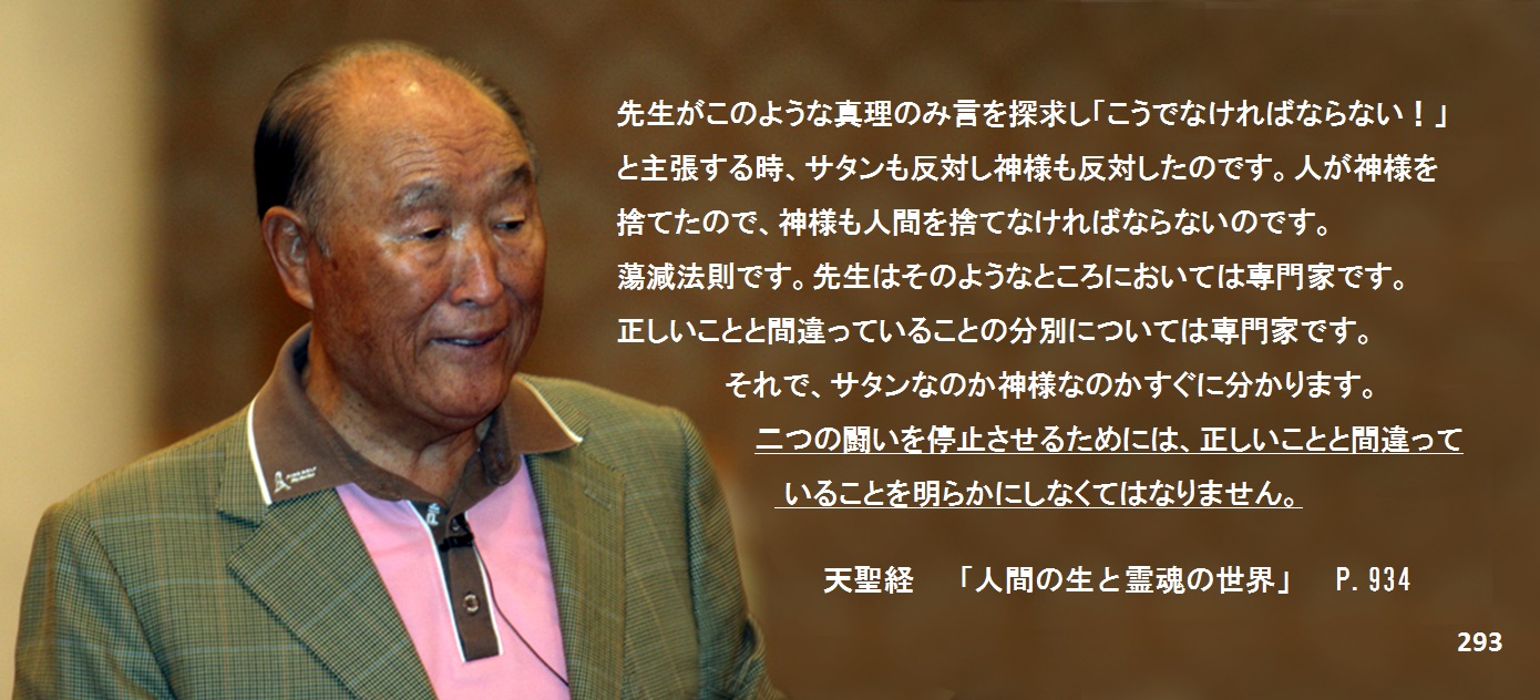 先生はそのようなところにおいては専門家です。正しいことと間違っていることの分別については専門家です。それで、サタンなのか神様なのかすぐに分かります。すべて見たところ、違っているのです。ですから押しまくるのです。すると最後に神様も大騒ぎするのです。霊界が混乱して、レバレンド・ムーン一人を中心として、霊界がすべて動揺して大変なことになったというのです。神様は審判の主人なので、最後に主人が責任を負わなければなりません。全霊界がレバレンド・ムーンを前に立て神様に讒訴する局面なのです。それで、神様が定義を立て審判しなければならないというのです。二つの闘いを停止させるためには、正しいことと間違っていることを明らかにしなくてはなりません。