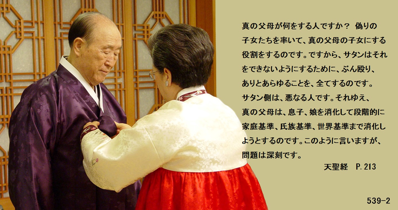 真の父母が何をする人ですか? 偽りの子女たちを率いて、真の父母の子女にする役割をするのです。ですから、サタンはそれをできないようにするために、ぶん殴り、ありとあらゆることを皆するのです。サタン側は、悪なる人です。それゆえ、真の父母は、息子、娘を消化して段階的に家庭基準、氏族基準、世界基準まで消化しようとするのです。このように言いますが、問題は深刻です。(一四九・二八〇)