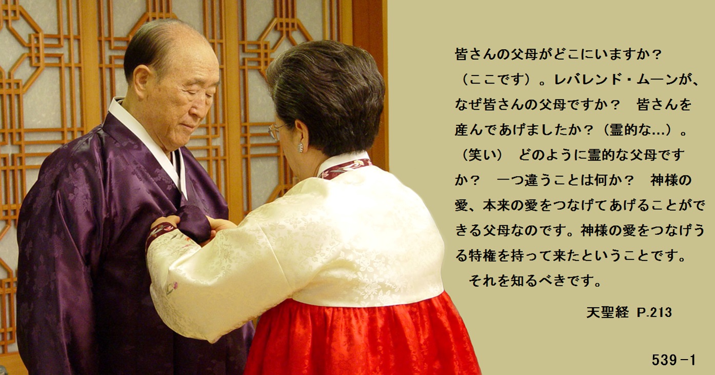 皆さんの父母がどこにいますか?(ここです)。レバレンド・ムーンが、なぜ皆さんの父母ですか? 皆さんを産んであげましたか?(霊的な…)。(笑い) どのように霊的な父母ですか? 一つ違うことは何か? 神様の愛、本来の愛をつなげてあげることができる父母なのです。神様の愛をつなげうる特権を持って来たということです。それを知るべきです。