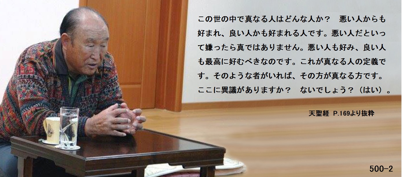 真なる方は好きな者だけ好むのではなく、自分を殺せという怨讐までも好まなければなりません。彼の前には、すべてを任せることができ、すべてを相談したくもあり、すべてを願うこともできる立場にある人であってこそ、真なる人です。分かりますか? もう真なる人が分かったでしょう?(はい!)
