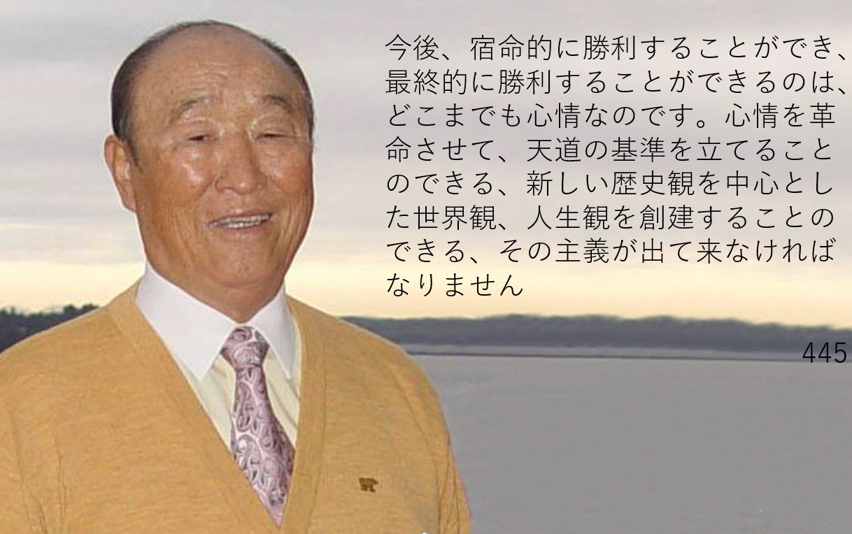 それではその根拠地がどこなのでしょうか? それが、「心情の世界」だというのです。心情の世界において、父は、子供がなければ生きられず、妻は、夫がなければ生きられません。今後来たるべき世界は、真実なる世界です。今後、宿命的に勝利することができ、最終的に勝利することができるのは、どこまでも心情なのです。心情を革命させて、天道の基準を立てることのできる、新しい歴史観を中心とした世界観、人生観を創建することのできる、その主義が出て来なければなりません。それが心情的な人生観、心情的な世界観と宇宙観であるのです。これが歴史の期待するところだというのです。