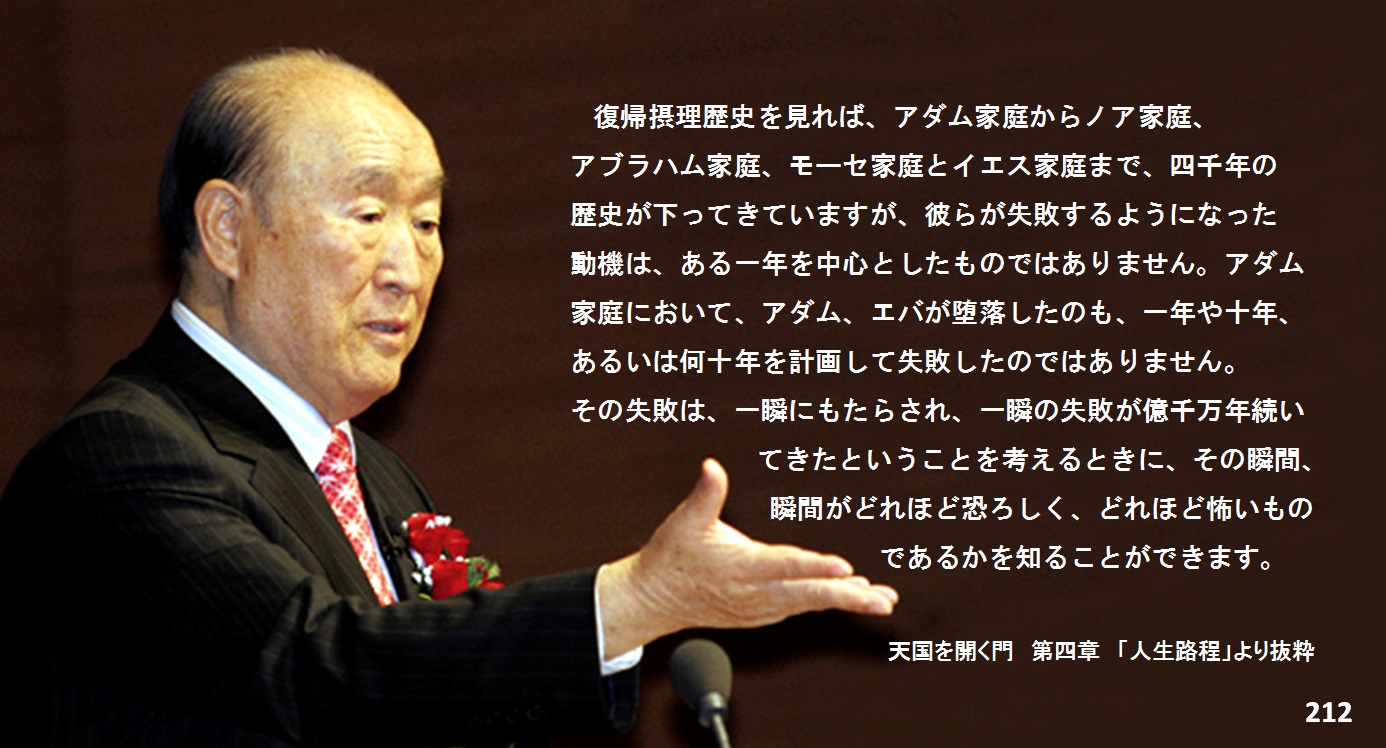 その一瞬の失敗で、歴史時代に修行の道を行った数多くの人たちが、受難の報いを受けなければならず、そのみ旨についていかない数多くの民族が、滅亡の窮地に落ちなければなりませんでした。それが、とてつもない蕩減の祭物の起源になったというのです。このような事実を考えるとき、一時間、カチッ、カチッという瞬間が恐ろしいのです。それゆえ、永遠の天国も一瞬を離れてはあり得ないのです。