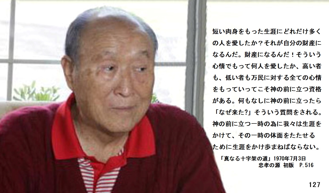 それが自分の財産になるんだよ。財産になるんだ!そういう心情でもって何人を愛したか、高い者も、低い者も万民に対する全ての心情をもっていってこそ神の前に立つ資格がある。何もなしに神の前に立ったら「なぜ来た?」そういう質問をされる。神の前に立つ一時の為に我々は生涯をかけて、その一時の体面をたたせるために生涯をかけ歩まねばならない。そうなんだよ。先生その一時の自分の体面がどういう体面で神の前に立つか、恥しい体面か、それと万民が、喜ぶような、万民が讃(たた)えるような、神が喜びほほえむ顔つきでもって「御苦労さん」と言われる立場か。だから君達もそうだろう。結局は霊界に行くんだろう。結局は霊界に行かなければならないし、霊界に登録しなければならないんだよ。今は手続きの方法をとっているんだ。それを一生涯かけてやる。特に堕落した人間はそうだろう。神の前に手続きをしなければならない。報告の内容が一致して「ああ、これだ!」となったら合格。だからこの期間にあって、まだ手続きを終えていない者は休む暇がない。いくら周囲でガアガア言って反対しても行く道が忙しいっていうんだ。日が暮れる前に自分の目的地に着かなければならない。