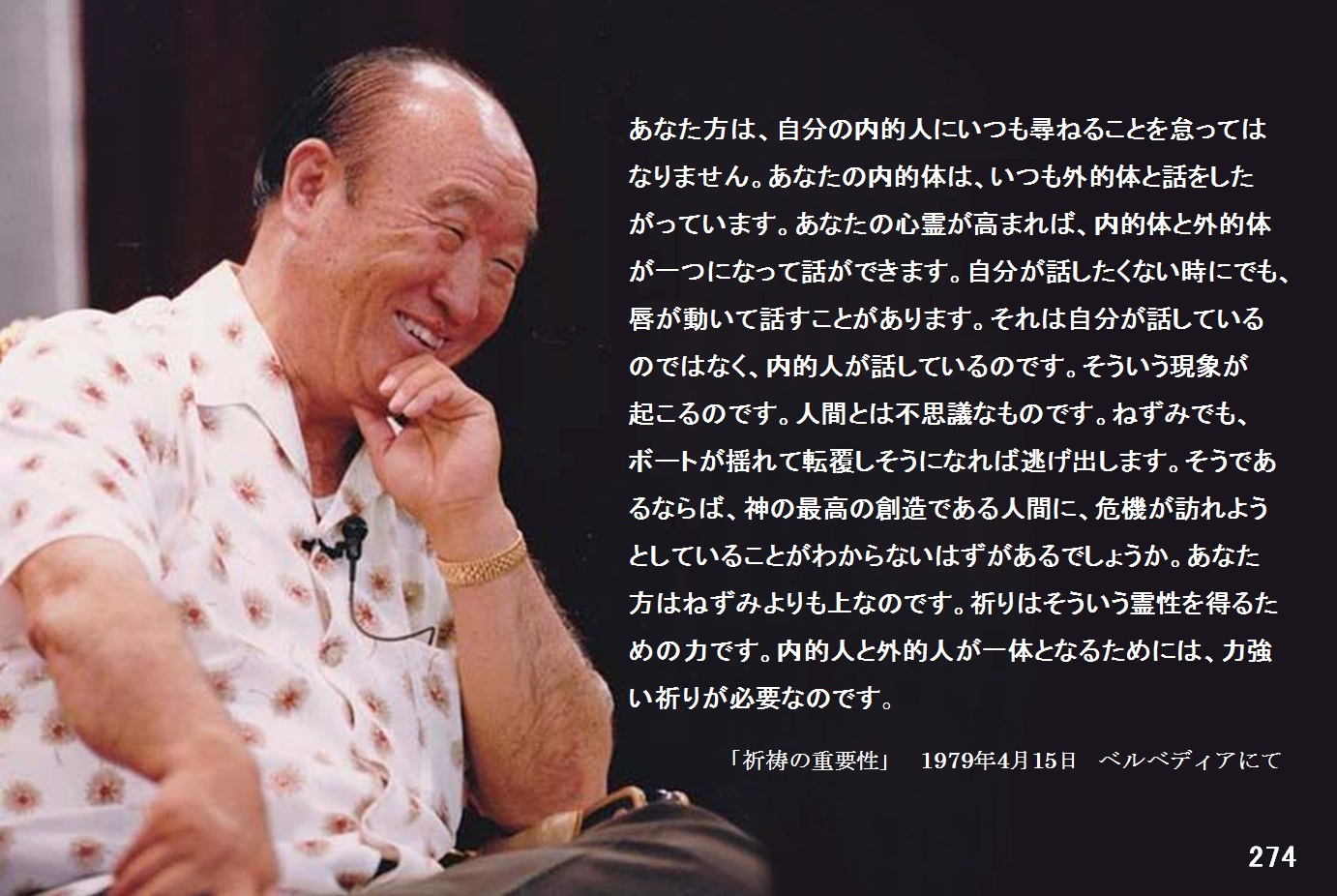 あなた方は、自分の内的人にいつも尋ねることを怠ってはなりません。あなたの内的体は、いつも外的体と話をしたがっています。あなたの心霊が高まれば、内的体と外的体が一つになって話ができます。自分が話したくない時にでも、唇が動いて話すことがあります。それは自分が話しているのではなく、内的人が話しているのです。そういう現象が起こるのです。人間とは不思議なものです。ねずみでも、ボートが揺れて転覆しそうになれば逃げ出します。そうであるならば、神の最高の創造である人間に、危機が訪れようとしていることがわからないはずがあるでしょうか。あなた方はねずみよりも上なのです。祈りはそういう霊性を得るための力です。内的人と外的人が一体となるためには、力強い祈りが必要なのです。