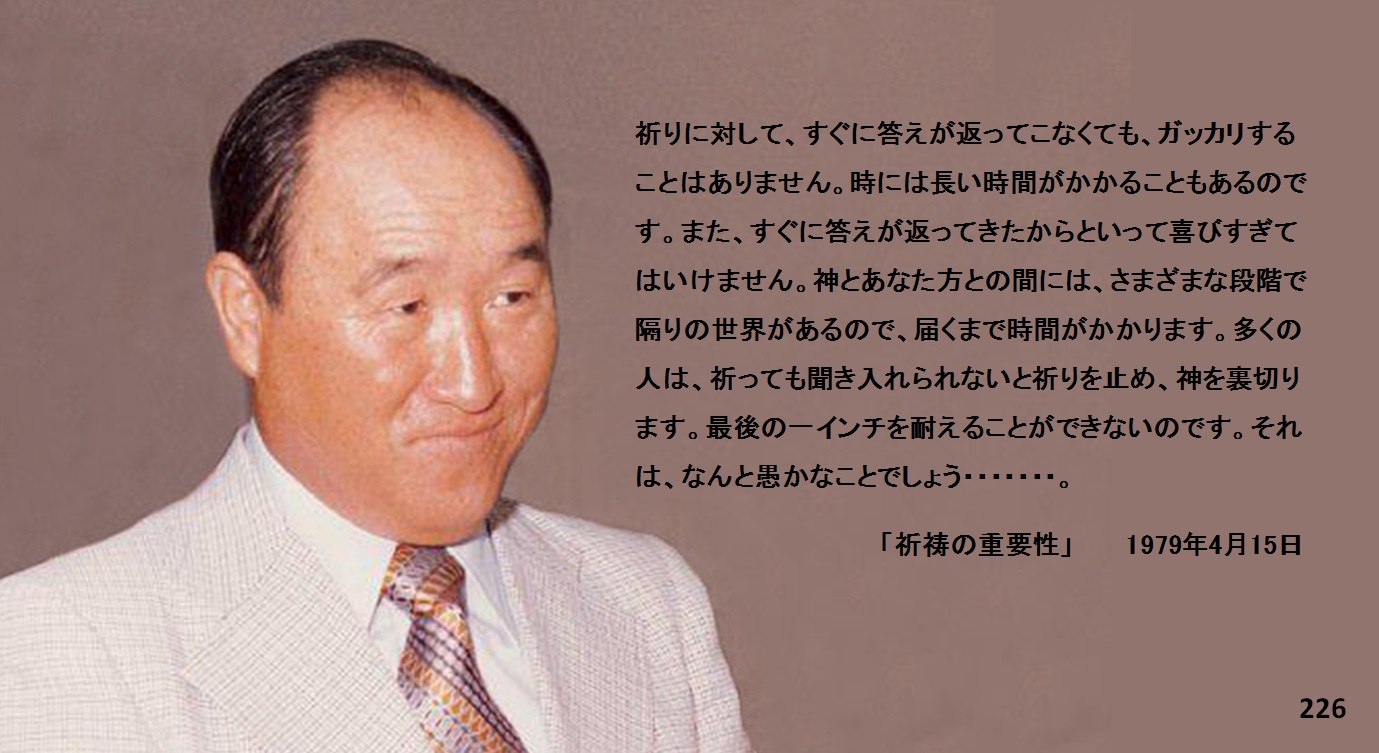 祈りに対して、すぐに答えが返ってこなくても、ガッカリすることはありません。時には長い時間がかかることもあるのです。また、すぐに答えが返ってきたからといって喜びすぎてはいけません。神とあなた方との間には、さまざまな段階で隔りの世界があるので、届くまで時間がかかります。多くの人は、祈っても聞き入れられないと祈りを止め、神を裏切ります。最後の一インチを耐えることができないのです。それは、なんと愚かなことでしょう。あなた方が世界のために祈っても、あなた方のまわりで、すぐには何も起こりません。それで、その祈りはあなた方にとって意味がないように思われるかも知れませんが、しかし遠く共産主義の世界では崩壊が始まっているのです。祈りによる衝撃は向こうに伝わっています。あなた方がアベルの立場にいるとすれば、その答えはカインの方からくるのです。それが届くには時間がかかるのです。