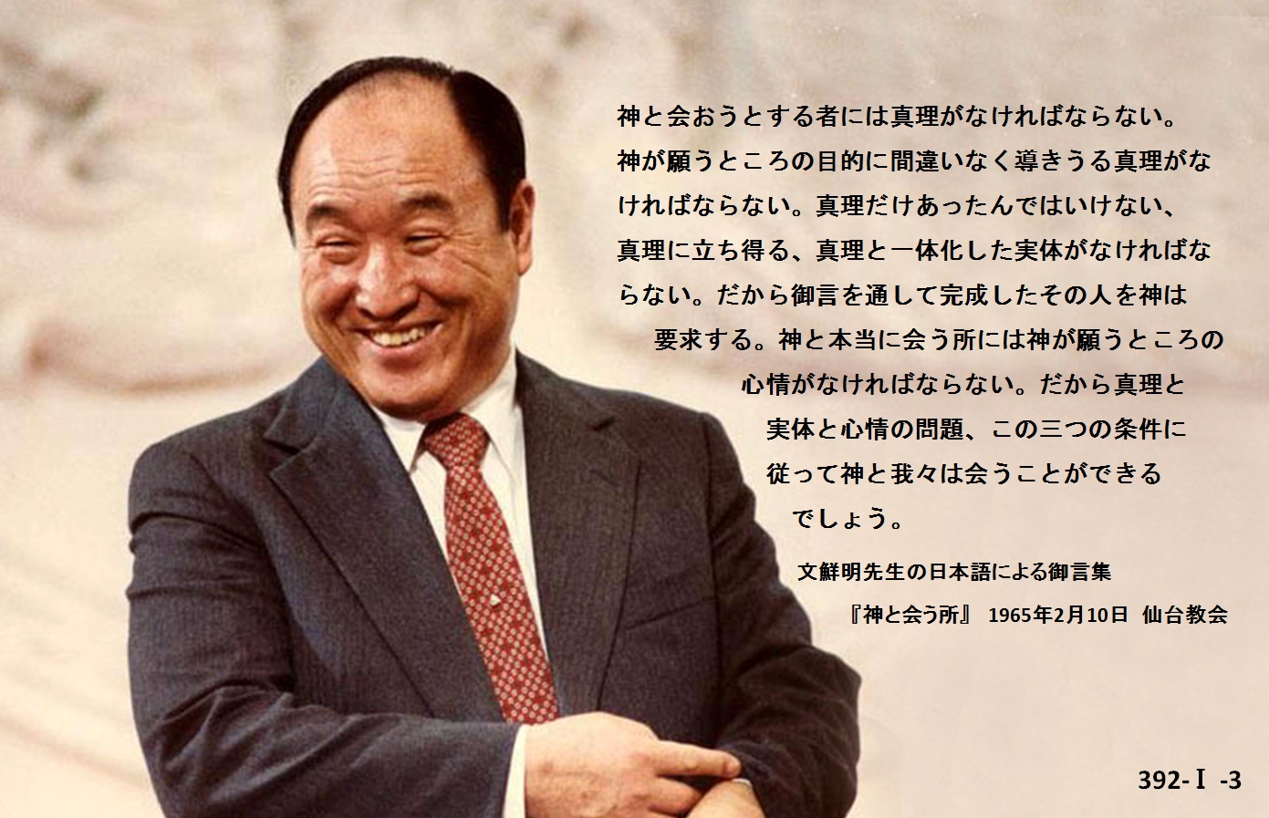 神と如何なる所で会うべきや。神と会う所は如何なる所かということを思うときに、神と会おうとする者には真理がなければならない。神が願うところの目的に間違いなく導きうる真理がなければならない。真理だけあったんではいけない、真理に立ち得る、真理と一体化した実体がなければならない。基台がなければならない。だから御言を通して完成したその人を神は要求する。神と本当に会う所には神が願うところの心情がなければならない。だから真理と実体と心情の問題、この三つの条件に従って神と我々は会うことができるでしょう。