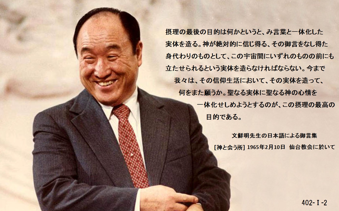 今まで我々は、その信仰生活において、その実体を造って、何をまた願うか。聖なる実体に聖なる神の心情を一体化せしめようとするのが、この摂理の最高の目的である。それが摂理に従って、真理の道をたどっていく最高の目的基準となっておる。だから、アダムが神の言葉と実体と心情をなくした結果、天と地が、神と我々が、真の親と子女が、理想の家族、理想郷のふるさとと我々が、それらが皆別れてしまうようになったというんですね。これを取り次ぐ重要な問題は、真理の問題であり、実体の問題であり、それは心情の問題になっておる、そういうふうになるわけですね。