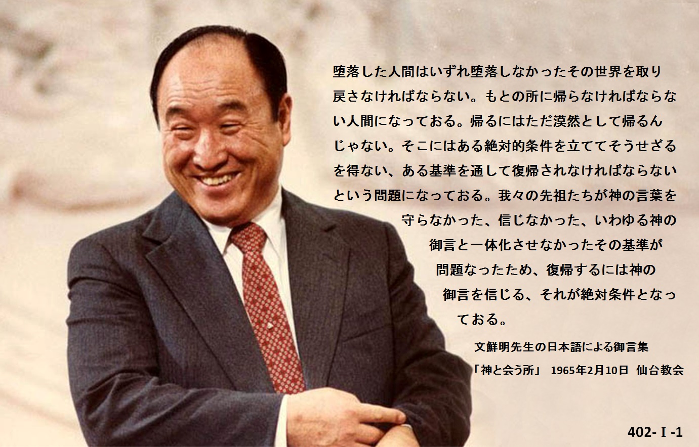 人間は堕落した。堕落したためにどういう結果を来たしたかというと、我々は天の父を失ってしまった。天の父を失うと同時に、我々は「真の父母」を失ってしまったという結果になりました。それと共に、父母がいなくなったから真の家庭もなく、真の氏族、或いは民族、国家、世界がなくなってしまった。堕落の結果によって、こういう結果になりました。もし我々先祖たちが堕落しなくて神の言う言葉を守り、その御心にかなう立場に立っておったならば、我々人間としては神の願う実体となって、神の御理想を地上に得ると共に、その理想郷を動かし得る神の心情を我々は当然神から授からなければならない、我々は得なければならないという立場に立つべきであった。