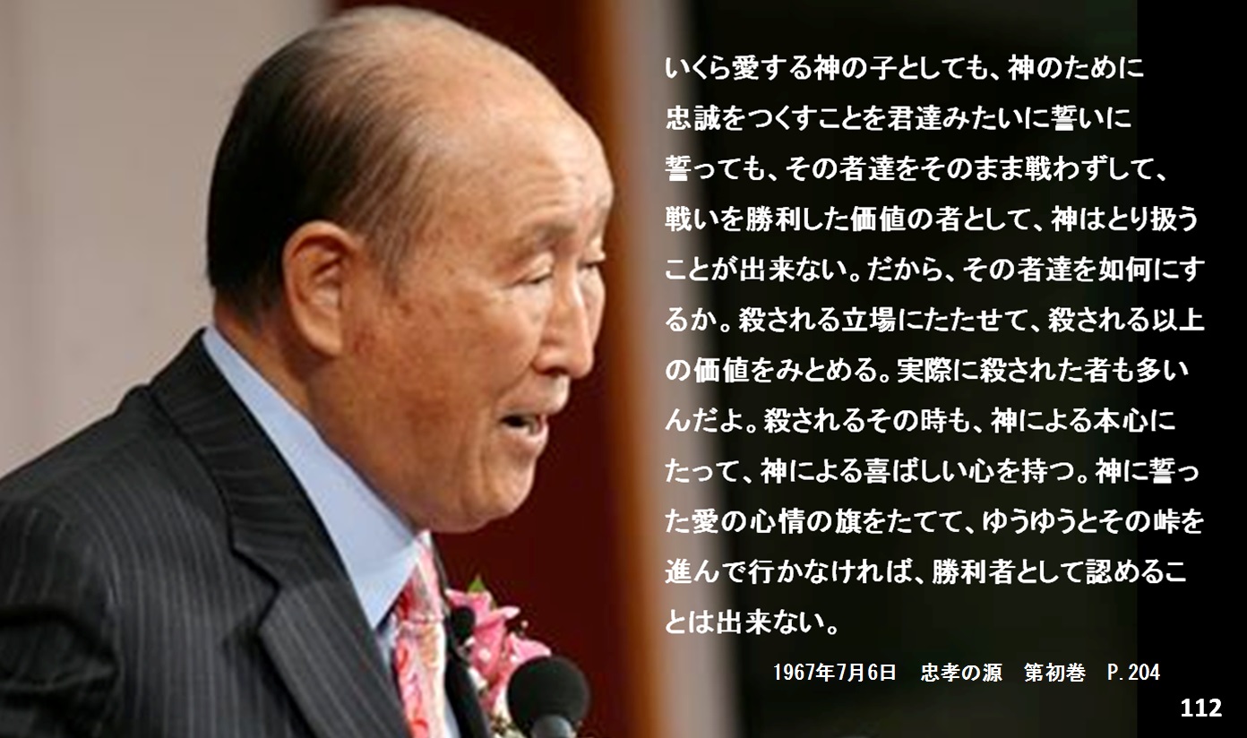 いくら愛する神の子としても、神のために忠誠をつくすことを君達みたいに誓いに誓っても、その者達をそのまま戦わずして、戦いを勝利した価値の者として、神はとり扱うことが出来ない。だから、その者達を如何にするか。殺される立場にたたせて、殺される以上の価値をみとめる。実際に殺された者も多いんだよ。殺されるその時も、神による本心にたって、神による喜ばしい心を持つ。神に誓った愛の心情の旗をたてて、ゆうゆうとその峠を進んで行かなければ、勝利者として認めることは出来ない。そういうふうにやるべきなのが、戦いの真只中に立たせた神のみ意なのですが、歴史上におきまして、そういう立場にあって、神の心情の旗をたててどうどうと行ったものは一人も居なかった。個人と家庭と民族と国家的に、その立場にたっていたのが、イスラエル民族であった。しかし、その道を行こうとする立場はたったんだけれども、まだこの道を旗をたてて民族的に峠を越えることは出来なかった。そういう戦いに勝利したものは一人もいなかった。