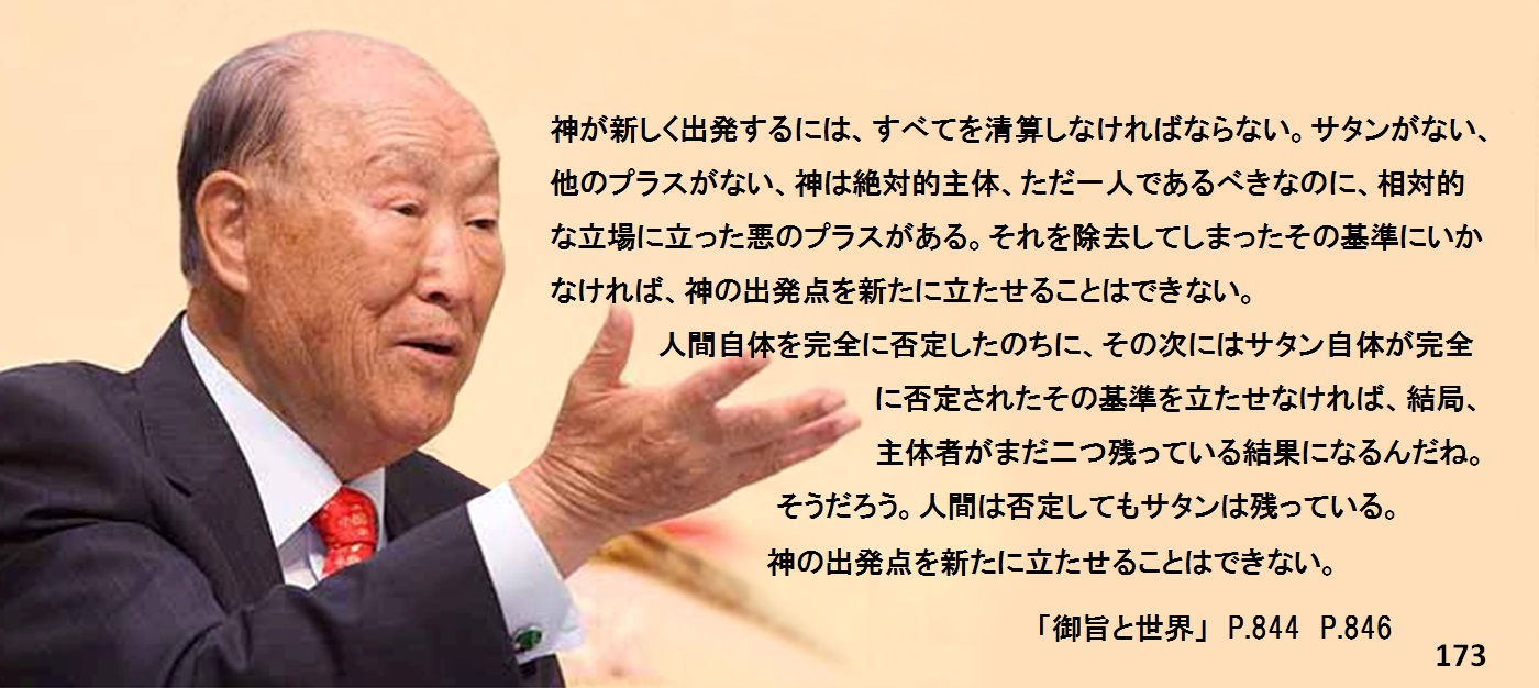 神が新しく出発するには、すべてを清算しなければならない。サタンがない、他のプラスがない、神は絶対的主体、ただ一人であるべきなのに、相対的な立場に立った悪のプラスがある。それを除去してしまったその基準にいかなければ、神の出発点を新たに立たせることはできない。