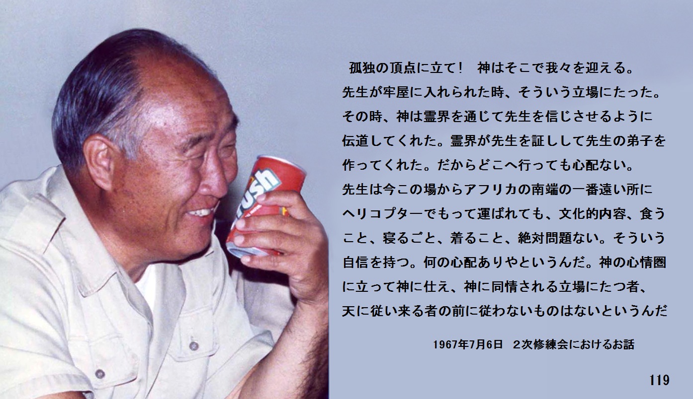 先生は涙をどれぐらい流したか。ある時は3日間位泣きに泣いた。そうして天の心情の深奥にふれた。今でもそれを考えると、全精神をかたむけて、つきつめた表現出来ない神の心情に立つと、実にかわいそうな、かわいそうなイエス様である。それ以上に実に孤独な世界に立っている先生がね、その孤独な先生が君達に必要か? (はい) 孤独の頂点に立て! 神はそこで我々を迎える。