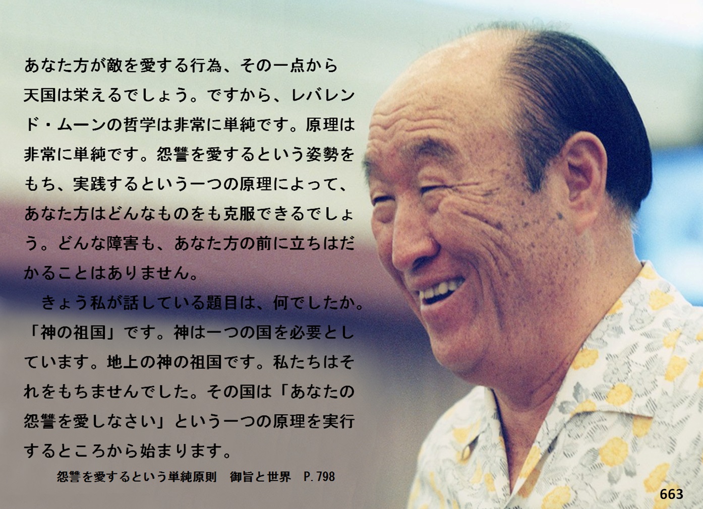 きょう私が話している題目は、何でしたか。「神の祖国」です。神は一つの国を必要としています。地上の神の祖国です。私たちはそれをもちませんでした。その国は「あなたの怨讐を愛しなさい」という一つの原理を実行するところから始まります。