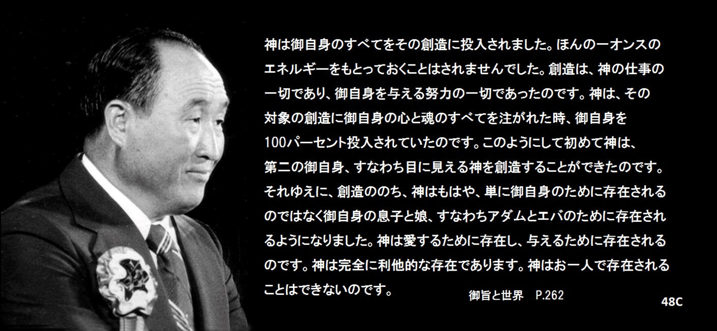 それゆえに、創造ののち、神はもはや、単に御自身のために存在されるのではなく御自身の息子と娘、すなわちアダムとエバのために存在されるようになりました。神は愛するために存在し、与えるために存在されるのです。神は完全に利他的な存在であります。神はお一人で存在されることはできないのです。