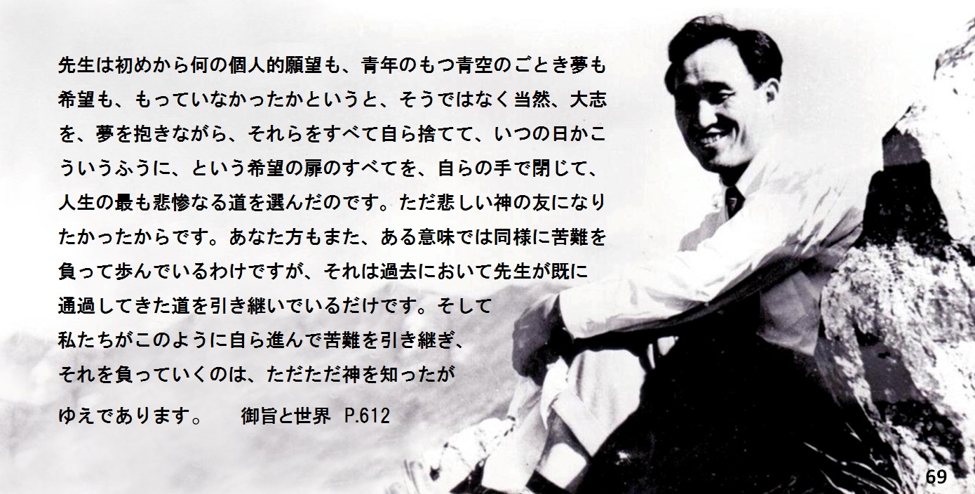 では、先生は初めから何の個人的願望も、青年のもつ青空のごとき夢も希望も、もっていなかったかというと、そうではなく当然、大志を、夢を抱きながら、それらをすべて自ら捨てて、いつの日かこういうふうに、という希望の扉のすべてを、自らの手で閉じて、人生の最も悲惨なる道を選んだのです。ただ悲しい神の友になりたかったからです。あなた方もまた、ある意味では同様に苦難を負って歩んでいるわけですが、それは過去において先生が既に通過してきた道を引き継いでいるだけです。そして私たちがこのように自ら進んで苦難を引き継ぎ、それを負っていくのは、ただただ神を知ったがゆえであります。