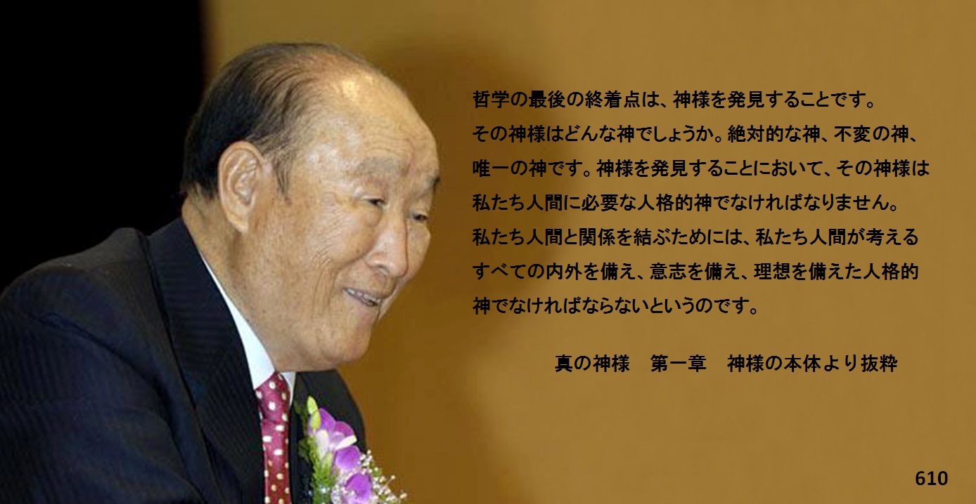 神様がいらっしゃるならば、神様の摂理を通して行かなければ、世界が未来に希望を残す何ものもないという、論理的な結果として結論を下すことになりました。ここにおいて統一教会が出てきて、神様がいるという実存性と、知情意の完成基準に立った人格的神を認定し、心情圏を中心とした理想世界を実現しようとしたのです。統一教会が初めて、神と人間の関係を確実にしたというのです。