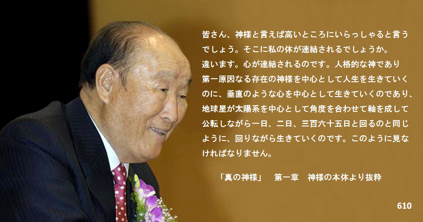 神様がいらっしゃるならば、神様の摂理を通して行かなければ、世界が未来に希望を残す何ものもないという、論理的な結果として結論を下すことになりました。ここにおいて統一教会が出てきて、神様がいるという実存性と、知情意の完成基準に立った人格的神を認定し、心情圏を中心とした理想世界を実現しようとしたのです。統一教会が初めて、神と人間の関係を確実にしたというのです。