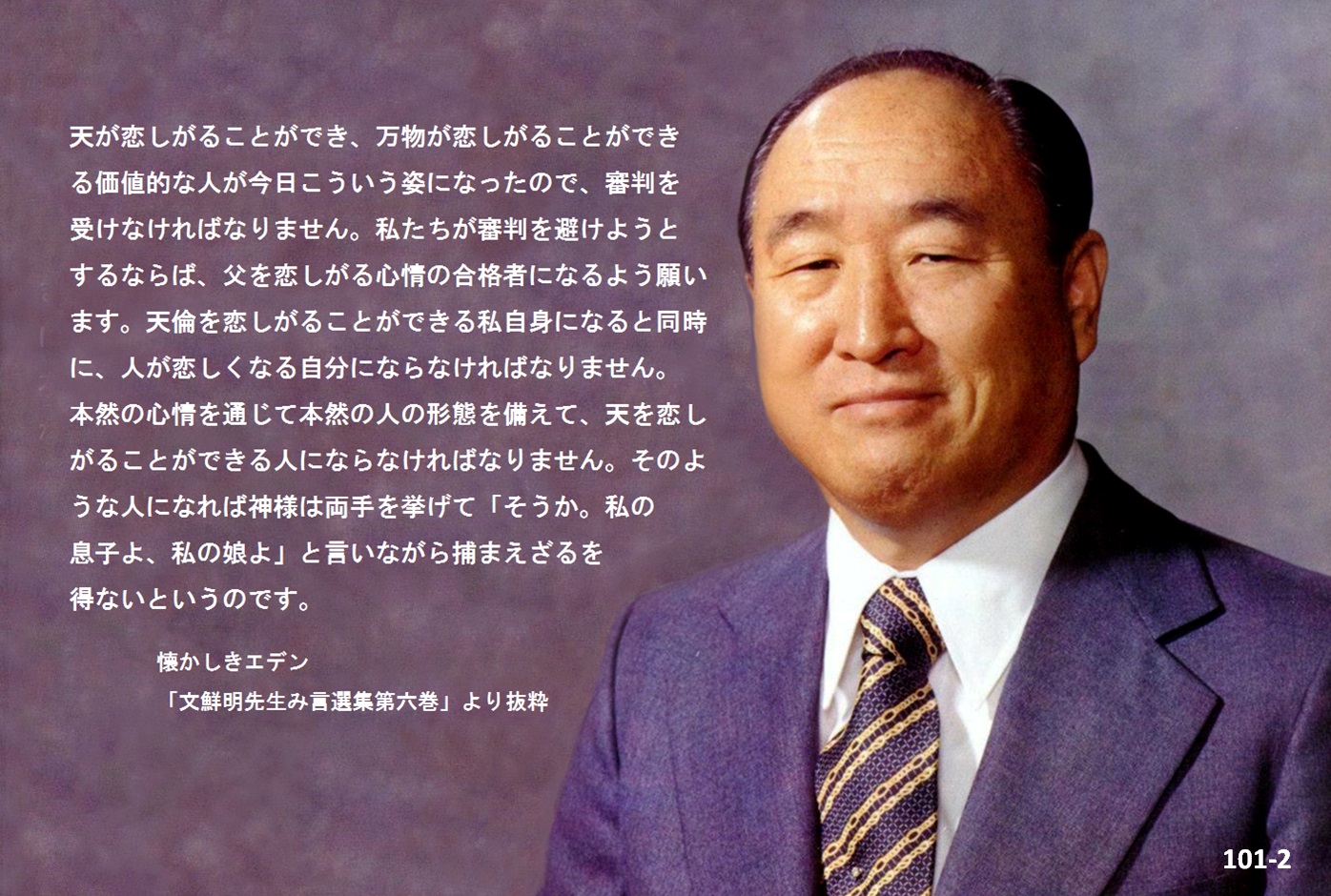 天が恋しがることができ、万物が恋しがることができる価値的な人が今日こういう姿になったので、審判を受けなければなりません。これから私たちが審判を避けようとするならば、父を恋しがる心情の合格者になるよう願います。エデンにアダムとエバを造り楽しんでいらっしゃった心、行ってみたくて、会ってみたいその心、その心情に合格することによって審判を避けて歌うことができる一つの勝利者になれるよう願います」と祈らなければなりません。天はそういう私たちになることを望んでいます。