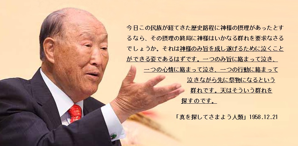 今日この民族が経てきた歴史路程に神様の摂理があったとするなら、その摂理の終局に神様はいかなる群れを要求なさるでしょうか。それは神様のみ旨を成し遂げるために泣くことができる姿であるはずです。一つのみ旨に絡まって泣き、一つの心情に絡まって泣き、一つの行動に絡まって泣きながら先に祭物になるという群れです。天はそういう群れを探すのです。