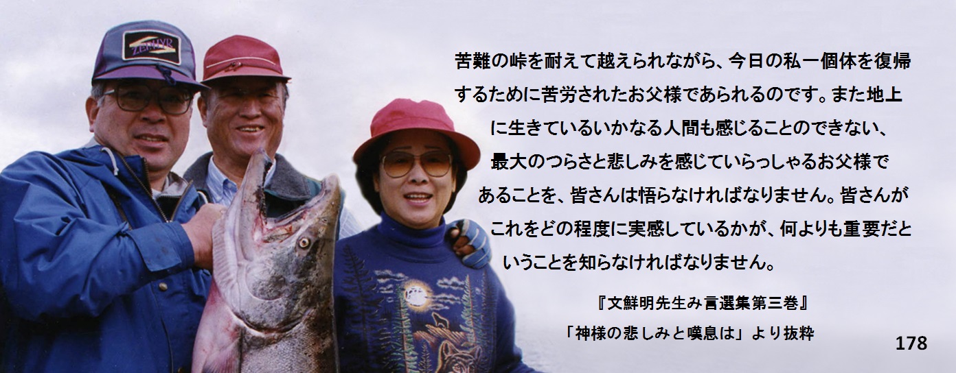 私たちが真のお父様と呼ぶそのお父様は、6000年の間、お休みになることもできずに闘ってこられたお父様であられ、摂理歴史を経てくる間、数限りない苦難の峠を耐えて越えられながら、今日の私一個体を復帰するために苦労されたお父様であられるのです。また地上に生きているいかなる人間も感じることのできない、最大のつらさと悲しみを感じていらっしゃるお父様であることを、皆さんは悟らなければなりません。皆さんがこれをどの程度に実感しているかが、何よりも重要だということを知らなければなりません。