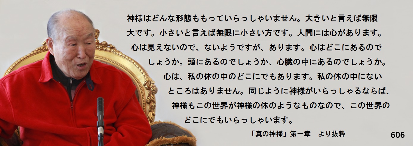 人間には心があります。心は見えないので、ないようですが、あります。心はどこにあるのでしょうか。頭にあるのでしょうか、心臓の中にあるのでしょうか。心は、私の体の中のどこにでもあります。私の体の中にないところはありません。同じように神様がいらっしゃるならば、神様もこの世界が神様の体のようなものなので、この世界のどこにでもいらっしゃいます。