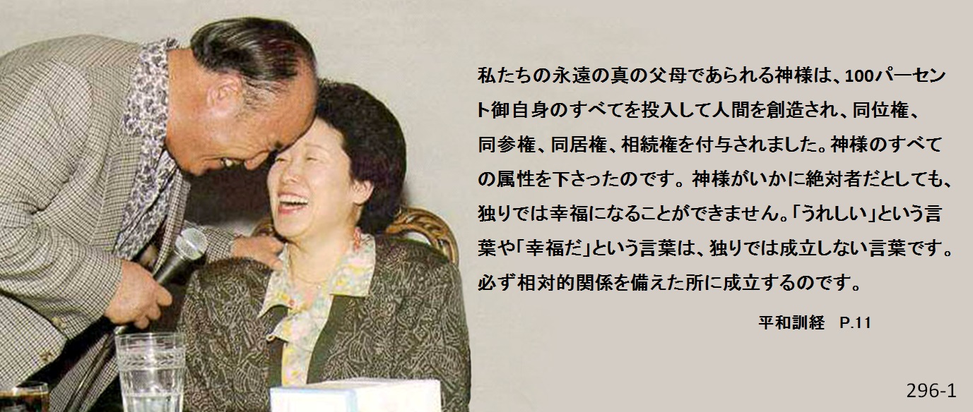 そうであるならば、父子の関係がもっている特性とは何でしょうか。真の愛と真の生命と真の血統の関係です。真の父母の真の愛が前提とならなければ、私たちの真の生命が存在することはできません。すなわち、神様の前に人間は、絶対的な真の愛の相対として創造されたということです。そこは、正に神様が父となり、人間は息子、娘となる軸が立てられる所なのです。