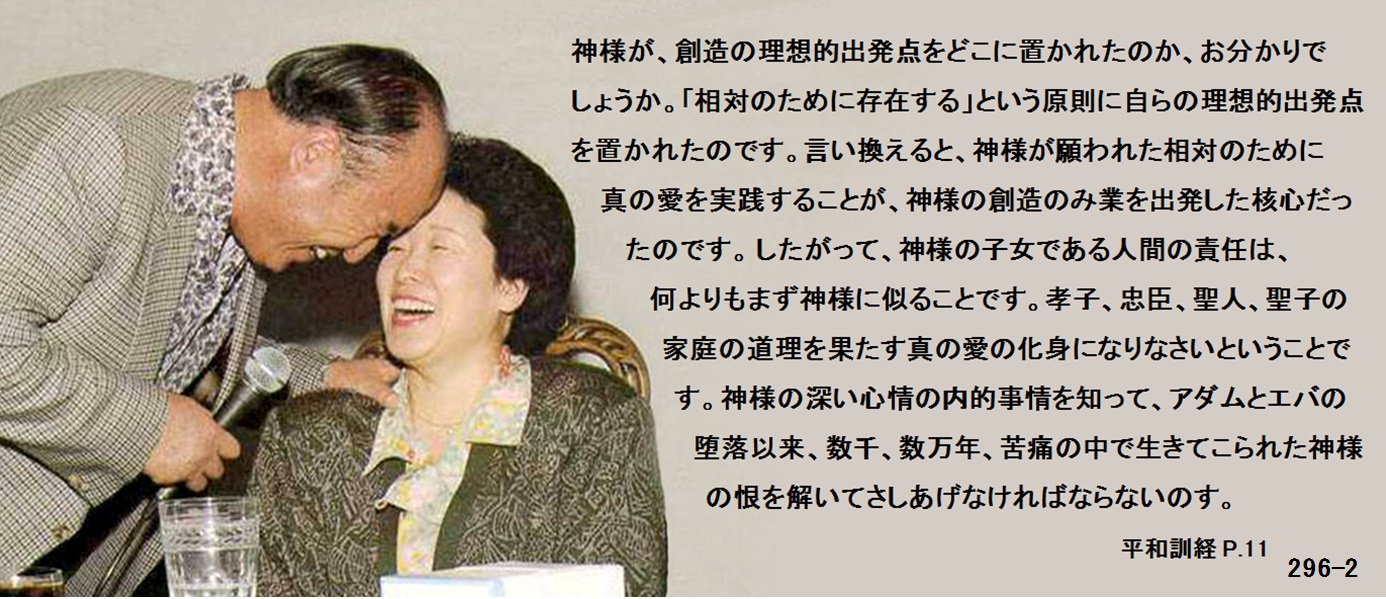 そうであるならば、父子の関係がもっている特性とは何でしょうか。真の愛と真の生命と真の血統の関係です。真の父母の真の愛が前提とならなければ、私たちの真の生命が存在することはできません。すなわち、神様の前に人間は、絶対的な真の愛の相対として創造されたということです。そこは、正に神様が父となり、人間は息子、娘となる軸が立てられる所なのです。