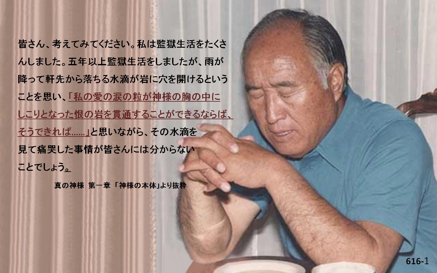 皆さん、考えてみてください。私は監獄生活をたくさんしました。五年以上監獄生活をしましたが、雨が降って軒先から落ちる水滴が岩に穴を開けるということを思い、「私の愛の涙の粒が神様の胸の中にしこりとなった恨の岩を貫通することができるならば、そうできれば……」と思いながら、その水滴を見て痛哭した事情が皆さんには分からないことでしょう。流れていく水を見て、この水の流れが神様をお迎えして神様が来られて沐浴することのできる澄んだ水の流れとなったらどれほど良いでしょうか。そのような愛の巣、安息所を、人間として神様に準備してさしあげることのできる子となったらどれほど良いでしょうか。そのような心情の深い世界を皆さんが体験できないとすれば、神様と関係がないのです。