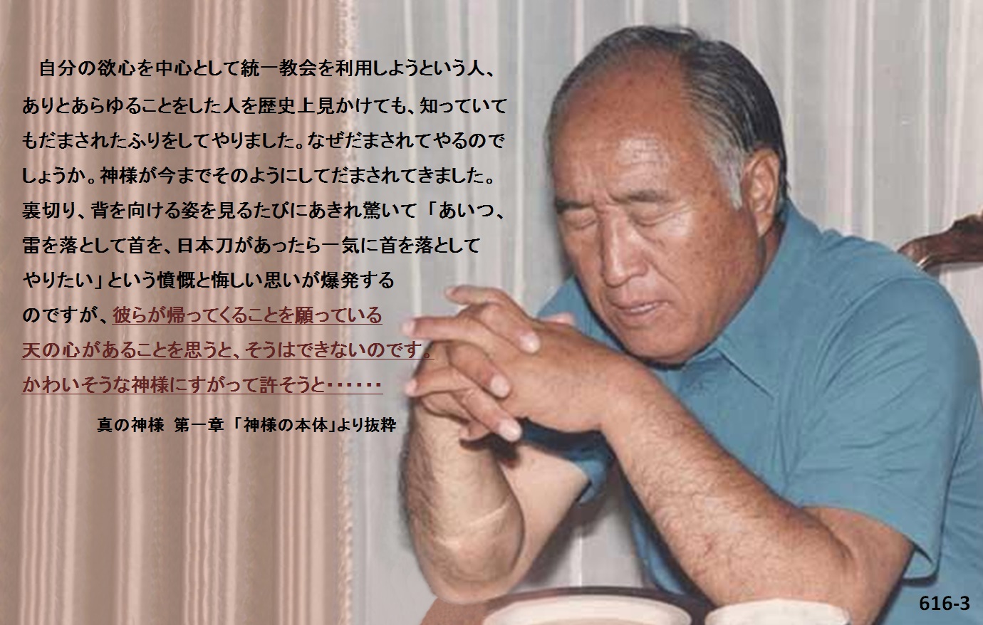 私は統一教会の教主になろうとは夢にも思いませんでした。今もそうです。私は教主という観念をもっていません。平民なのです。きょうも洋服を着ないでネクタイも結びませんでした。一つでも不足な装いをしてこそ気持ちが楽なのです。なぜでしょうか。統一教会の食口たちは全世界に広まって、この時間にも雨降る軒下でぬれた服を着て先生を慕いながら、「先生が御安泰であられるように」と敬拝していることを知っているからです。福を祈っている立場を蹂躙してはなりません。それで目さえ開けば眠れずに、このような罪人のような教主の生活をしているのです。それゆえに統一教会の教会員たちが文総裁を無視できないのです。