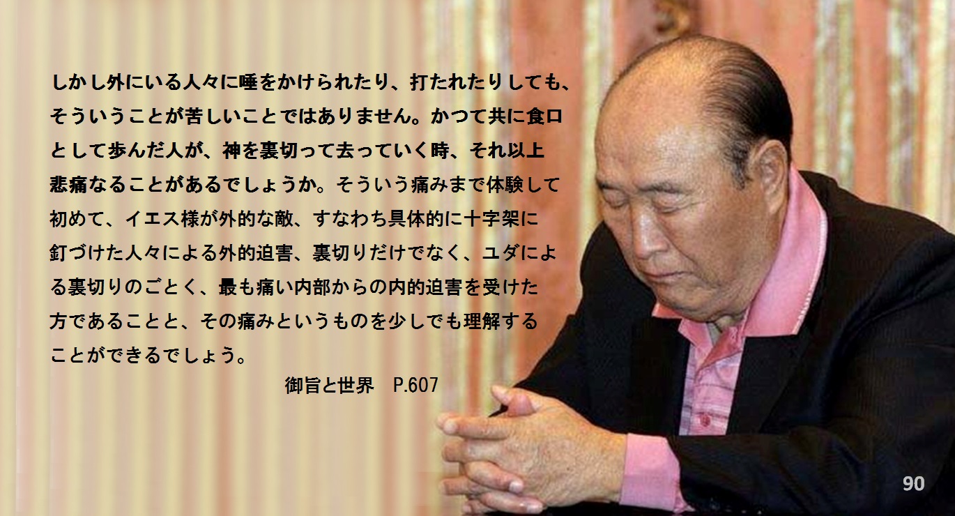 しかし外にいる人々に唾をかけられたり、打たれたりしても、そういうことが苦しいことではありません。かつて共に食口として歩んだ人が、神を裏切って去っていく時、それ以上悲痛なることがあるでしょうか。そういう痛みまで体験して初めて、イエス様が外的な敵、すなわち具体的に十字架に釘づけた人々による外的迫害、裏切りだけでなく、ユダによる裏切りのごとく、最も痛い内部からの内的迫害を受けた方であることと、その痛みというものを少しでも理解することができるでしょう。