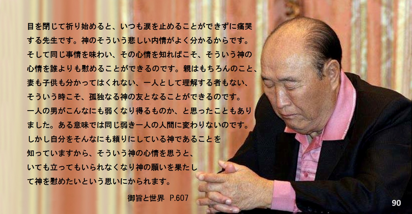 誰でも、先生の内面の世界をかいま見ることでもできたならば、ただ“わっ”と痛哭せずにおれないでしょう。特に、常に神に祈り、霊界を見たり啓示を受けたりしている霊通者たちは、みなこういうことを言ってきます。「文先生について祈る時は、いつも決まって神様からの答えは“涙”です」と。先生のことを祈ると神様は泣かれるというのです。寂しい一人の人、文先生を見つめる時、人知れずすすり泣いておられる神様なのです。