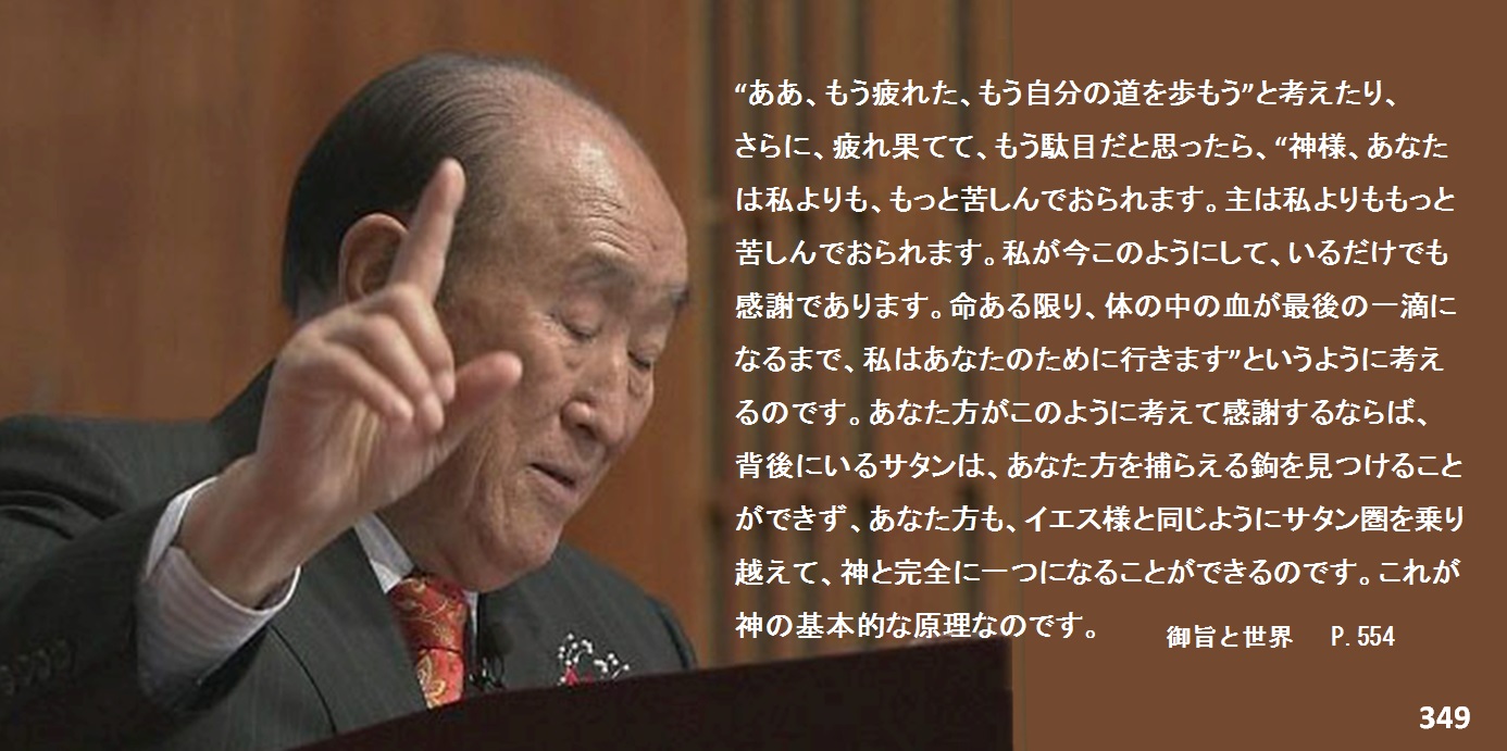あなた方が伝道に出かける時、もし、「ああ疲れた。自分はどうもこの仕事には向いていないから、どこかで休んでいよう」などと考えたとしたら、それはとても神を中心とした考え方であるとはいえません。多くの人が、「統一教会のメンバーはよく働く」というかもしれませんが、神の立場からすれば、まだまだ決して十分とはいえません。たとえあなた方がこれまで忍耐して一生懸命頑張ってきたものとしても、ここで音をあげてしまって、“ああ、もう疲れた、もう自分の道を歩もう”と考えたり、さらに、疲れ果てて、もう駄目だと思ったら、“神様、あなたは私よりも、もっと苦しんでおられます。主は私よりももっと苦しんでおられます。私が今このようにして、いるだけでも感謝であります。命ある限り、体の中の血が最後の一滴になるまで、私はあなたのために行きます”というように考えるのです。あなた方がこのように考えて感謝するならば、背後にいるサタンは、あなた方を捕らえる鉤を見つけることができず、あなた方も、イエス様と同じようにサタン圏を乗り越えて、神と完全に一つになることができるのです。これが神の基本的な原理なのです。だから、苦労が多くなればなるほど、困難が多くなればなるほど、私たちがサタン圏から解放されて、神の主管圏に近づきつつあるしるしである、ということをはっきり知らなければなりません。