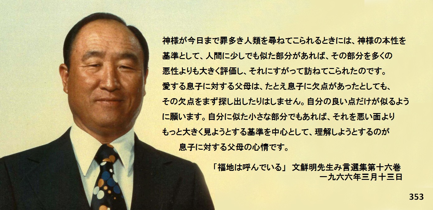 神様が今日まで罪多き人類を尋ねてこられるときには、神様の本性を基準として、人間に少しでも似た部分があれば、その部分を多くの悪性よりも大きく評価し、それにすがって訪ねてこられたのです。それが父母の心です