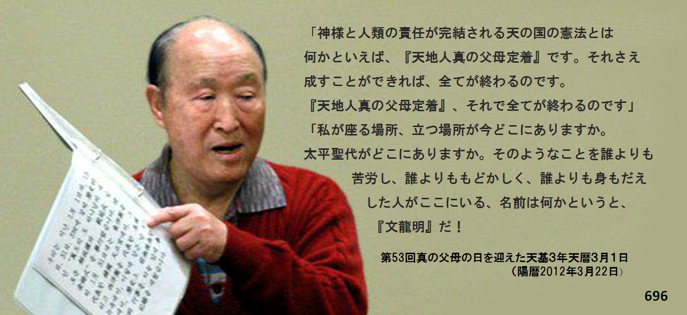 「神様と人類の責任が完結される天の国の憲法とは何かといえば、『天地人真の父母定着』です。それさえ成すことができれば、全てが終わるのです。その言葉は天一国を建てる前、12年前に立てた言葉です。『天地人真の父母定着』、それで全てが終わるのです」