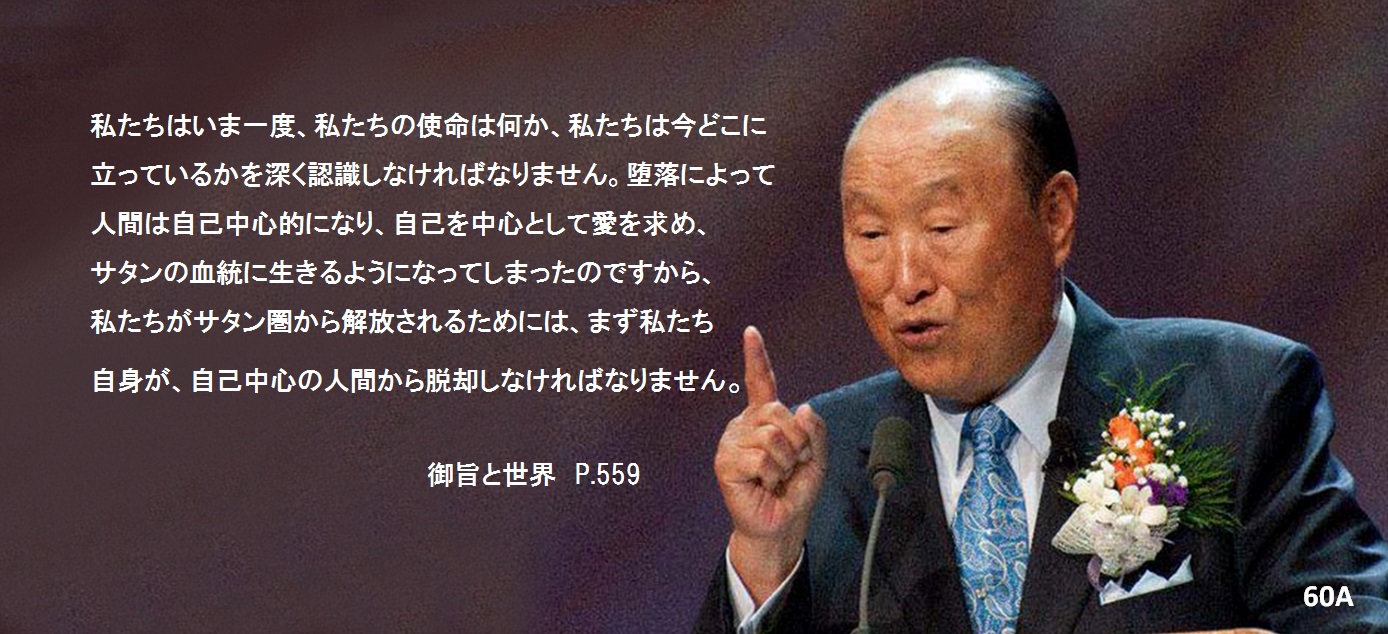 私たちはいま一度、私たちの使命は何か、私たちは今どこに立っているかを深く認識しなければなりません。堕落によって人間は自己中心的になり、自己を中心として愛を求め、サタンの血統に生きるようになってしまったのですから、私たちがサタン圏から解放されるためには、まず私たち自身が、自己中心の人間から脱却しなければなりません。