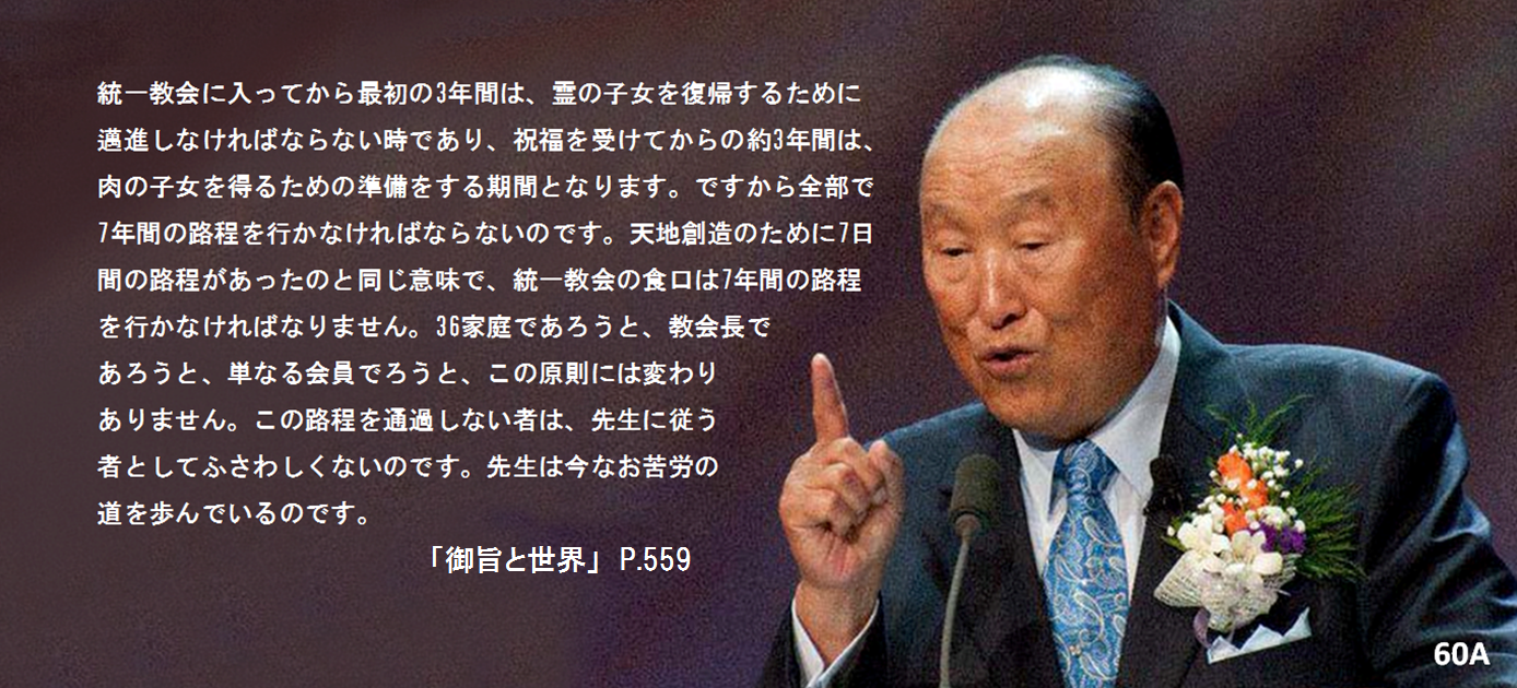 ですから全部で7年間の路程を行かなければならないのです。天地創造のために7日間の路程があったのと同じ意味で、統一教会の食口は7年間の路程を行かなければなりません。36家庭であろうと、教会長であろうと、単なる会員でろうと、この原則には変わりありません。この路程を通過しない者は、先生に従う者としてふさわしくないのです。先生は今なお苦労の道を歩んでいるのです。