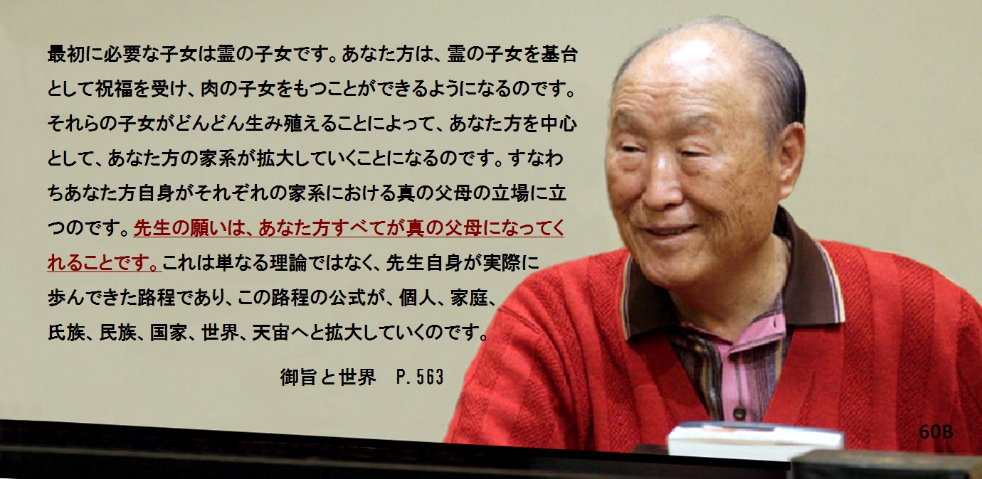 最初に必要な子女は霊の子女です。あなた方は、霊の子女を基台として祝福を受け、肉の子女をもつことができるようになるのです。それらの子女がどんどん生み殖えることによって、あなた方を中心として、あなた方の家系が拡大していくことになるのです。すなわちあなた方自身がそれぞれの家系における真の父母の立場に立つのです。