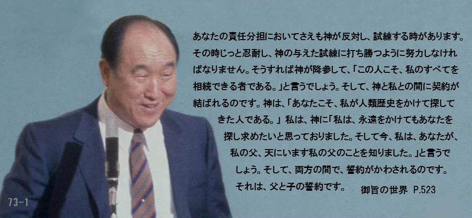 そして、神と私との間に契約が結ばれるのです。神は、「あなたこそ、私が人類歴史をかけて探してきた人である。私は、神に「私は、永遠をかけてもあなたを探し求めたいと思っておりました。そして今、私は、あなたが、私の父、天にいます私の父のことを知りました。」と言うでしょう。そして、両方の間で、誓約がかわされるのです。それは、父と子の誓約です。