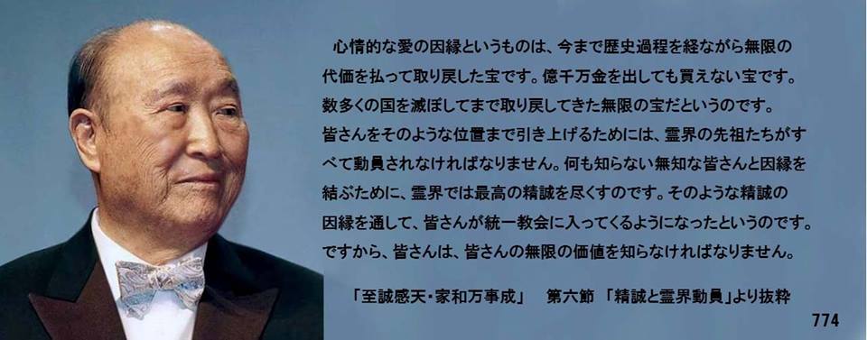 ですから、地上で私たちが公的な仕事や一つの国の仕事をするのは、一つの国の仕事ではありません。地上の仕事であると同時に、天上世界の仕事を解いていっているのです。皆さんがそうです。地上で恵沢を受け、地上にいる人たちが霊界と関係を結べば、皆さんが霊界に行ったとき、その人たちが、皆さんを中心としてすべて手足となり、どんな活動でもできる基盤になってくれるのです。(二六八―一八三、一九九五・四・一)