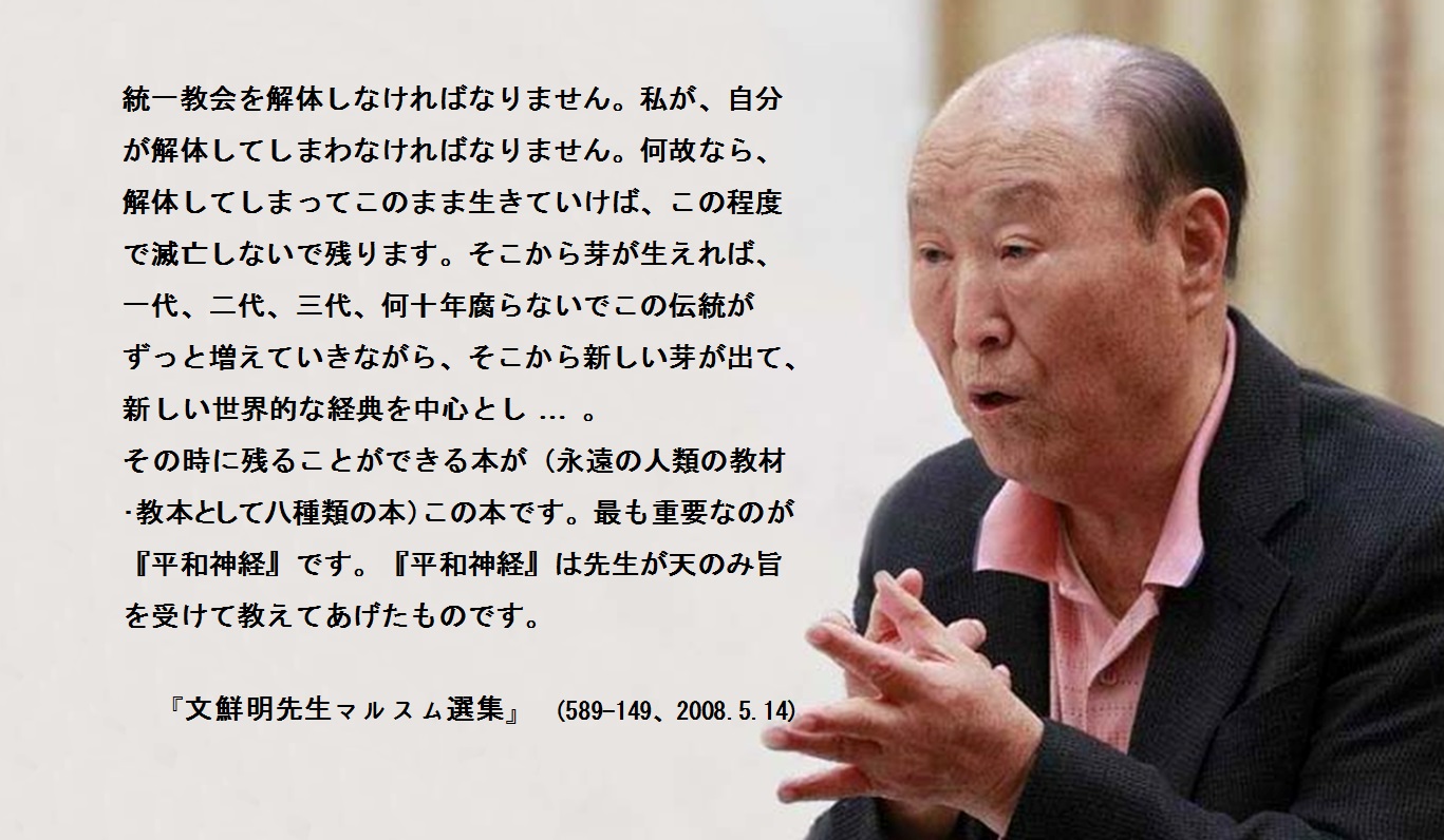 統一教会を解体しなければなりません。私が、自分が解体してしまわなければなりません。何故なら、解体してしまってこのまま生きていけば、この程度で滅亡しないで残ります。そこから芽が生えれば、一代、二代、三代、何十年腐らないでこの伝統がずっと増えていきながら、そこから新しい芽が出て、新しい世界的な経典を中心として … 。