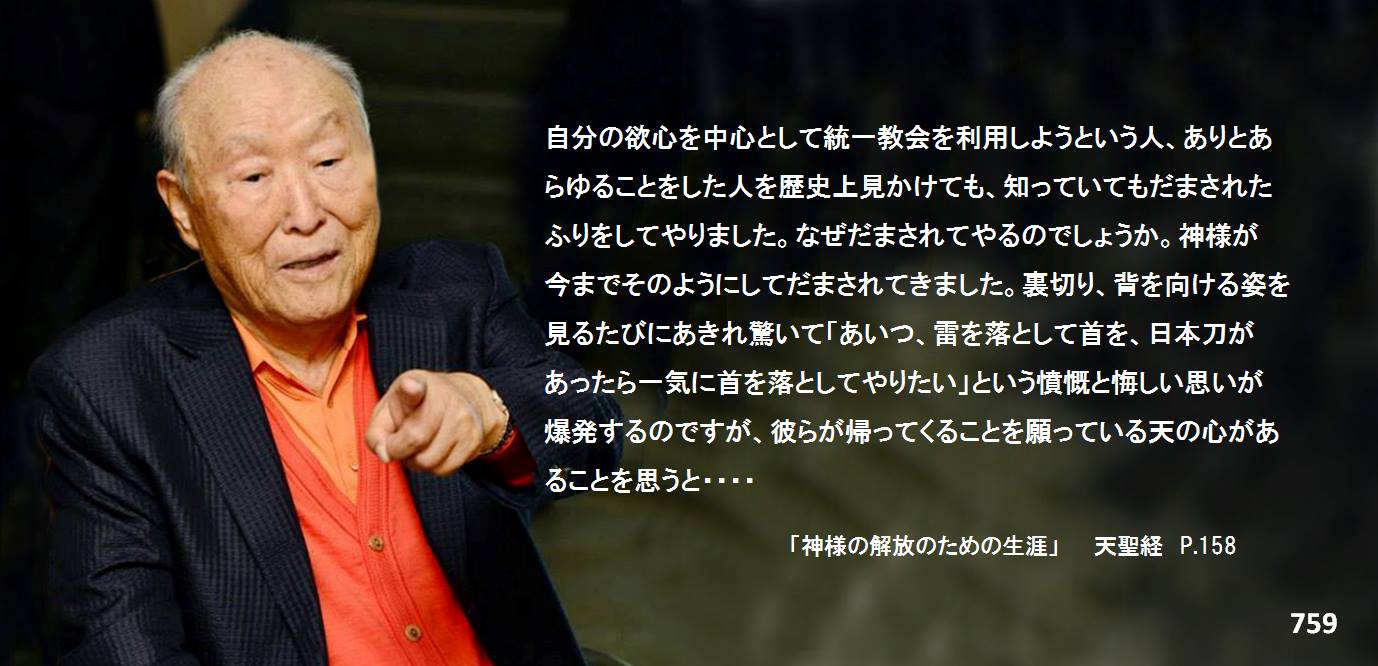 自分の欲心を中心として統一教会を利用しようという人、ありとあらゆることをした人を歴史上見かけても、知っていてもだまされたふりをしてやりました。なぜだまされてやるのでしょうか。神様が今までそのようにしてだまされてきました。裏切り、背を向ける姿を見るたびにあきれ驚いて「あいつ、雷を落として首を、日本刀があったら一気に首を落としてやりたい」という憤慨と悔しい思いが爆発するのですが、彼らが帰ってくることを願っている天の心があることを思うと、そうはできないのです。かわいそうな神様にすがって許そうという心をもってきたところ、そのたびに節ができます。分かりますか。統一教会の一つの節ができるのです。竹に節があるように、節ができるのです。そうして家庭的節目、氏族的節目、民族的節目を刻んでいくのです。