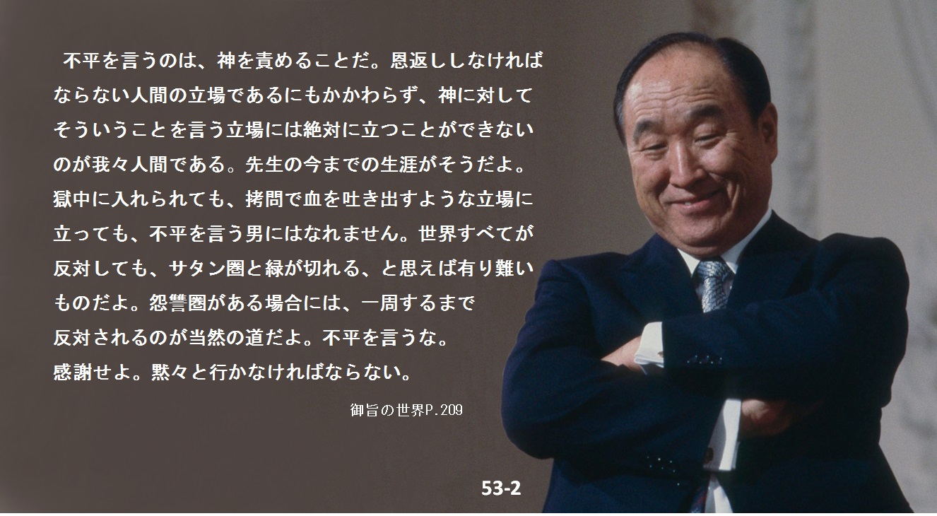 先生の今までの生涯がそうだよ。獄中に入れられても、拷問で血を吐き出すような立場に立っても、不平を言う男にはなれません。世界すべてが反対しても、サタン圏と緑が切れる、と思えば有り難いものだよ。怨讐圏がある場合には、一周するまで反対されるのが当然の道だよ。不平を言うな。 感謝せよ。黙々と行かなければならない。