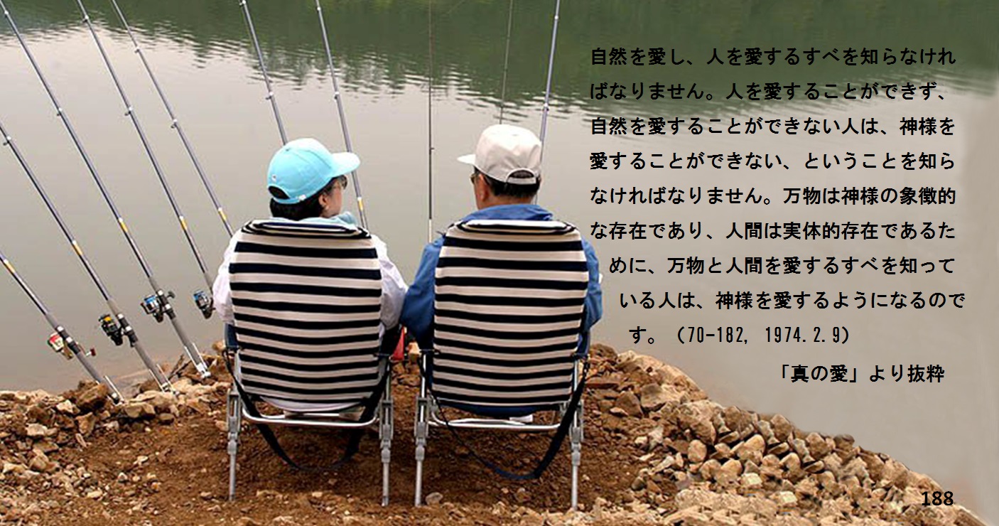 自然を愛し、人を愛するすべを知らなければなりません。人を愛することができず、自然を愛することができない人は、神様を愛することができない、ということを知らなければなりません。万物は神様の象徴的な存在であり、人間は実体的存在であるために、万物と人間を愛するすべを知っている人は、神様を愛するようになるのです。(70-182, 1974.2.9)