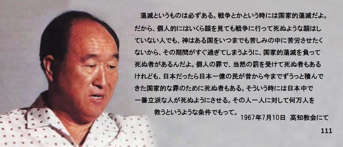 蕩減というものは必ずある。戦争とかという時には国家的蕩減だよ。だから、個人的にはいくら顔を見ても戦争に行って死ぬような顔はしていない人でも、神はある国をいつまでも苦しみの中に苦労させたくないから、その期間がすぐ過ぎてしまうように、国家的蕩減を負って死ぬ者があるんだよ。個人の罪で、当然の罰を受けて死ぬ者もあるけれども、日本だったら日本一億の民が昔から今までずうっと積んできた国家的な罪のために死ぬ者もある。そういう時には日本中で一番立派な人が死ぬようにさせる。その人一人に対して何万人を救うというような条件でもって。死ぬベき人でないような人が死ぬ。あなた達もそうだよ、蕩減を受ける。自分の過ちで蕩減を受けるのは当然の事だよ。しかし、他人の罪でもって蕩減を受ける。特に統一教会の兄姉達はそうなんだよ。