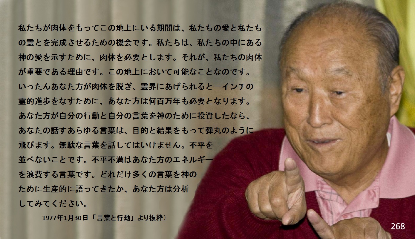 「言葉と行動」が、きょうの私の話題です。気高い人格の人間であるということは、その言葉と行動とが一つの共通の原理によって統一されており、話しと行動を完全に一致させて行うことを意味しています。私たちは話した通りに行動しない多くの人々を見ることができますが、しかしながらあなた方が、高貴な、あるいは神のような人をそのような観点からみた場合、彼らの言葉と行動が統一されていることを見い出すしょう。たとえどのような角度からみようとも、あなた方はそこに、矛盾ではなく調和と統一とを見い出すことでしょう。では、あなた方は完全に言葉と行動とにおいて一つとなっていますか。自分自身の妻に対して、自分の国に対して、また神に対して、自分の言葉が自分の行動と矛盾しないと主張できるならば、その人は本当に完成された人間です。