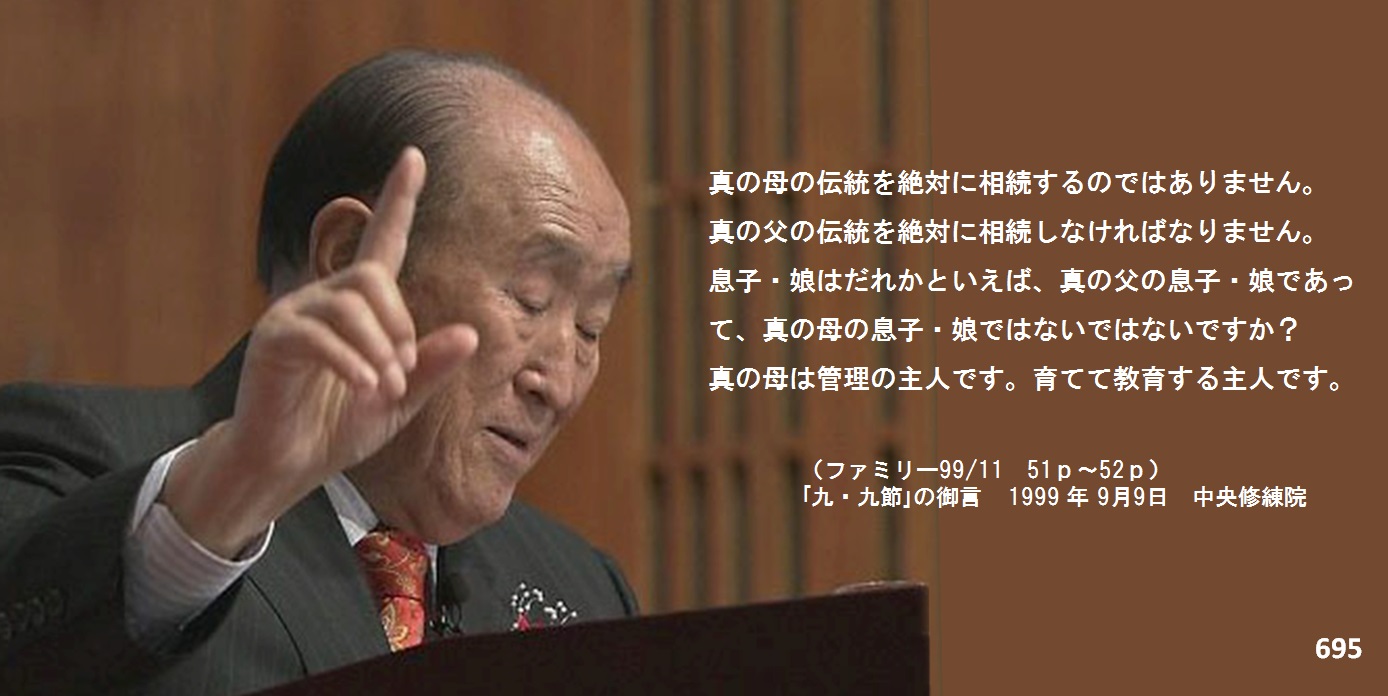 ですから、真の母の伝統を絶対に相続するのではありません。真の父の伝統を絶対に相続しなければなりません。息子・娘はだれかといえば、真の父の息子・娘であって、真の母の息子・娘ではないではないですか? 真の母は管理の主人です。 育てて教育する主人です。」