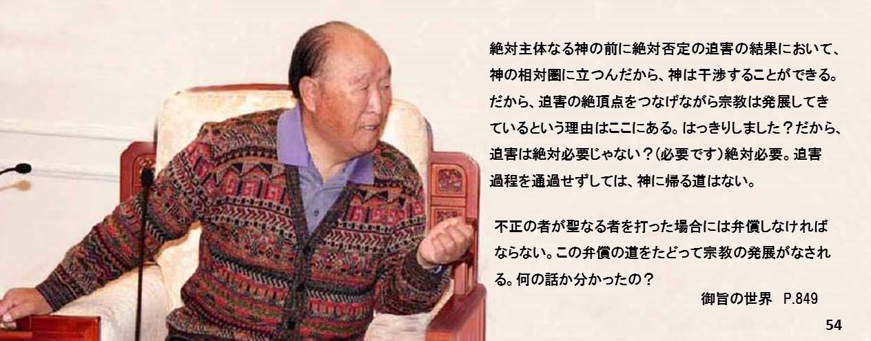 「宗教を信ずる者たちが自分自体で否定せよ!自分が否定圏をつくれ」と。それはつくれない。自分で否定圏をつくることができないから、相対関係において否定される基準をつくればいいんだね。立場が同じだよ。誰かに否定されるような立場に追い込まれればいい。何の話か分かった?自分自体が否定圏をつくることができないから、神様自体が否定圏をつくってやる。それみんな逆に打つんだ、みんな。これが迫害の動機である。分かった?何の話か。だから、神様を信じ、宗教を信ずるというと、みんな一番近い者が、親とか愛すべきもの自体が反対する。それは何を意味するかというと、結局はサタン自体が第二の主体圏に立って第一の主体を打ったことになる。だから、 不正の者が聖なる者を打った場合には弁償しなければならない。この弁償の道をたどって宗教の発展がなされる。何の話か分かったの?