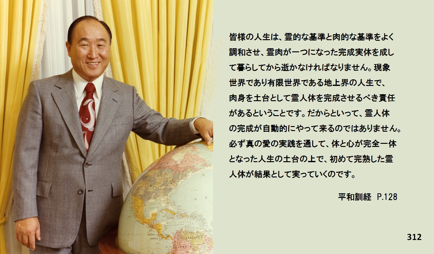 現象世界であり有限世界である地上界の人生で、肉身を土台として霊人体を完成させるべき責任があるということです。だからといって、霊人体の完成が自動的にやって来るのではありません。必ず真の愛の実践を通して、体と心が完全一体となった人生の土台の上で、初めて完熟した霊人体が結果として実っていくのです。