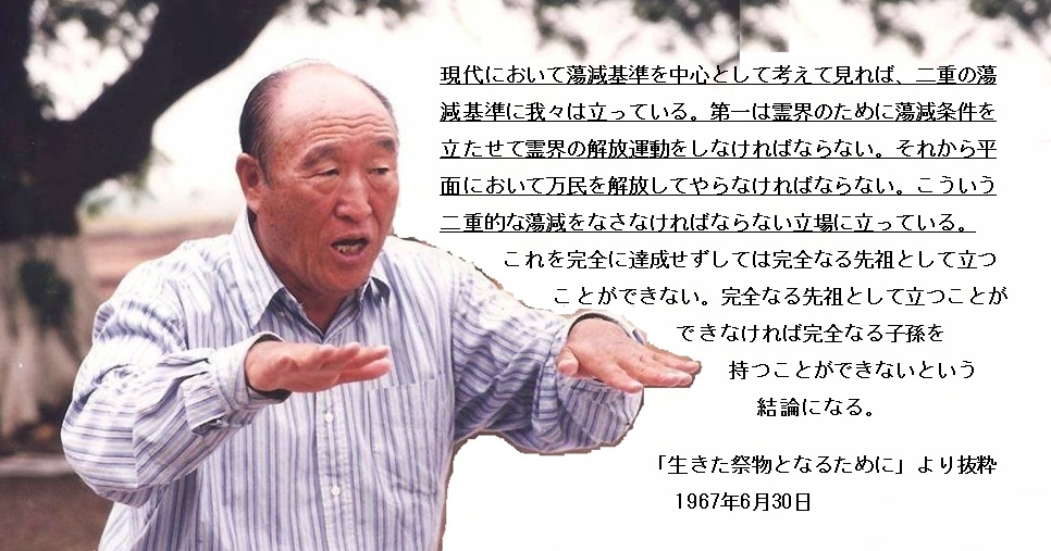霊界には何千億という数多くの霊人体たちが住んでおる。これ世界三十六億というと、これはあの霊人たちはどのくらい多くの人が住んでいるかというと、それは数えきれない多くの霊人たちが、嘆いて我々に対して望みを持っているというんだね。だから彼らに対して我々は二重の使命を持っている。現代において蕩減基準を中心として考えて見れば、二重の蕩減基準に我々は立っている。第一は霊界のために蕩減条件を立たせて霊界の解放運動をしなければならない。それから平面において万民を解放してやらなければならない。こういう二重的な蕩減をなさなければならない立場に立っている。これを完全に達成せずしては完全なる先祖として立つことができない。完全なる先祖として立つことができなければ完全なる子孫を持つことができないという結論になる。そうだろう?(「はい」)。