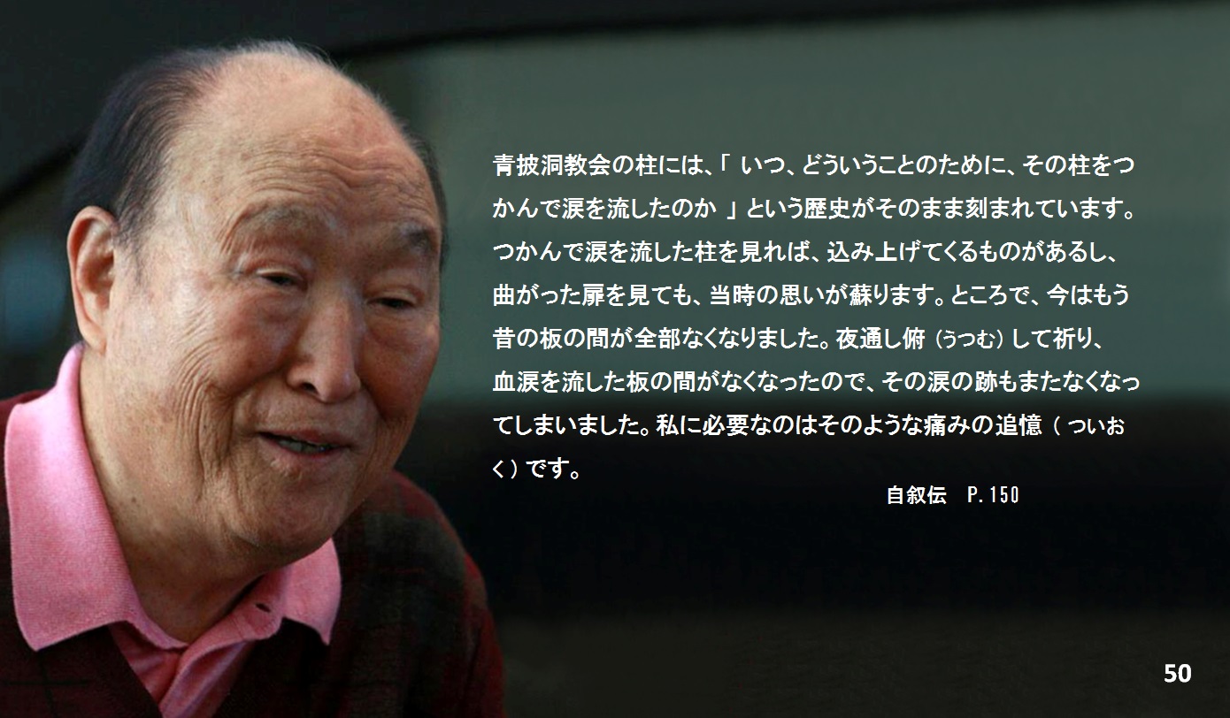 青披洞教会の柱には、「いつ、どういうことのために、その柱をつかんで涙を流したのか」という歴史がそのまま刻まれています。つかんで涙を流した柱を見れば、込み上げてくるものがあるし、曲がった扉を見ても、当時の思いが蘇ります。ところで、今はもう昔の板の間が全部なくなりました。夜通し俯して祈り、血涙を流した板の間がなくなったので、その涙の跡もまたなくなってしまいました。私に必要なのはそのような痛みの追憶です。