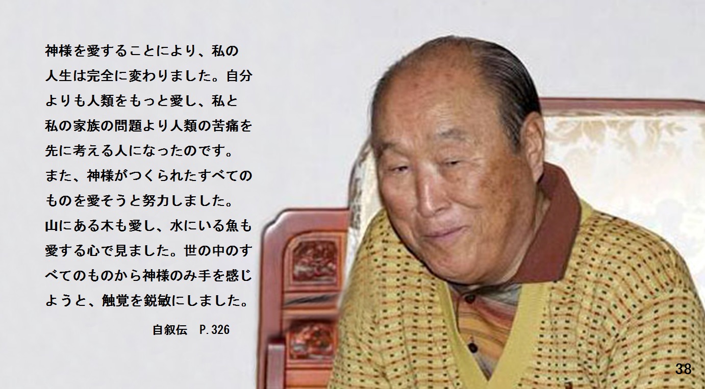 神様を愛することにより、私の人生は完全に変わりました。自分よりも人類をもっと愛し、私と私の家族の問題より人類の苦痛を先に考える人になったのです。また、神様がつくられたすべてのものを愛そうと努力しました。山にある木も愛し、水にいる魚も愛する心で見ました。世の中のすべてのものから神様のみ手を感じようと、触覚を鋭敏にしました。